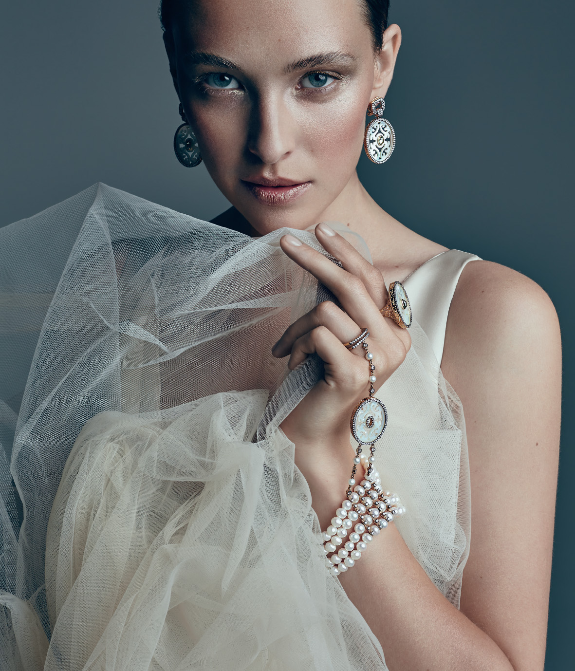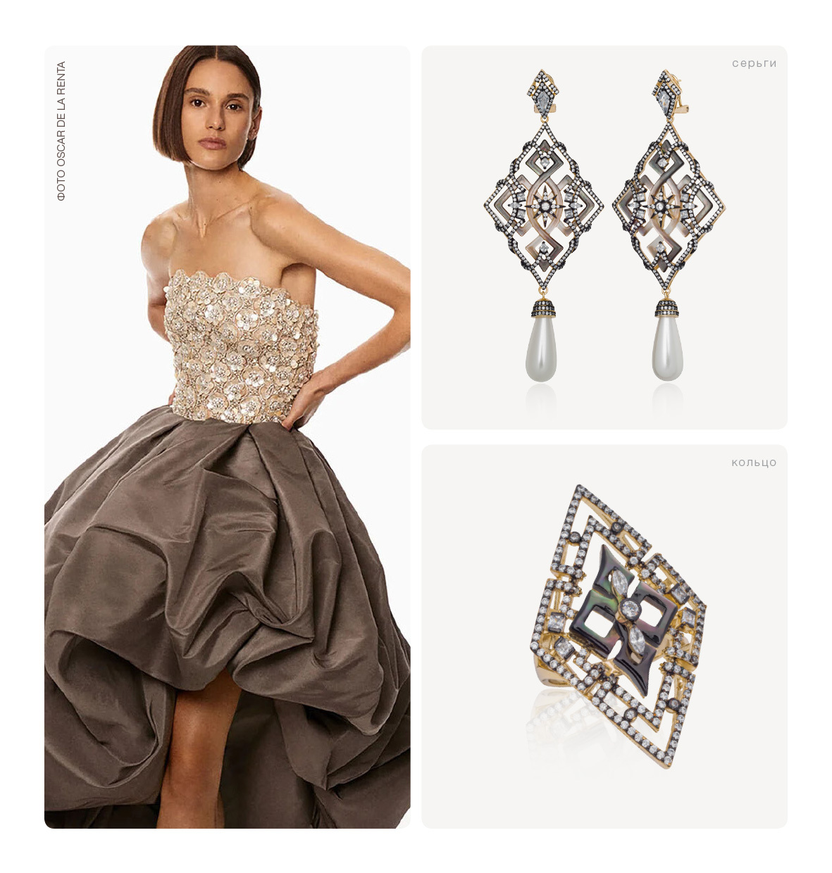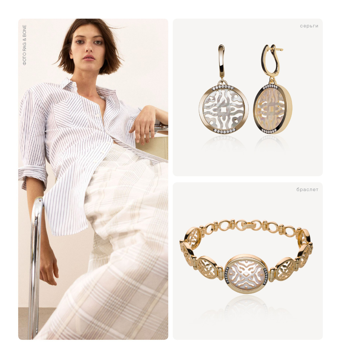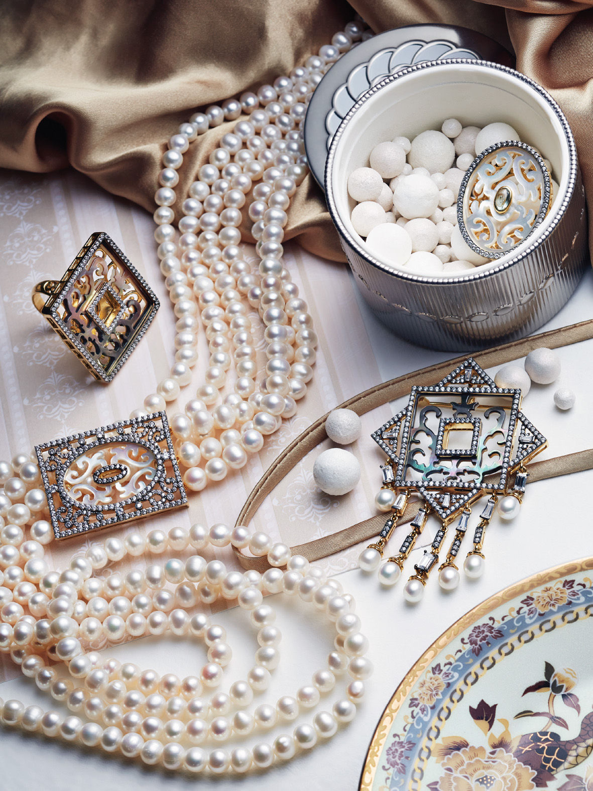 В основе коллекции – изысканная резьба по перламутру, где каждый завиток – гимн мастерству ручной работы ювелиров. Мягкие переливы света и цвета гармонично дополняются ярким сиянием камней – фианитов бриллиантовой огранки. Их блеск добавляет коллекции то самое праздничное настроение и ощущение роскоши, столь характерное для эпохи ар-деко.